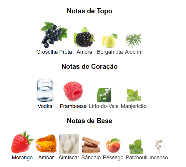 As notas de coração são: Vodka, Framboesa, Lírio-do-Vale e Manjericão.